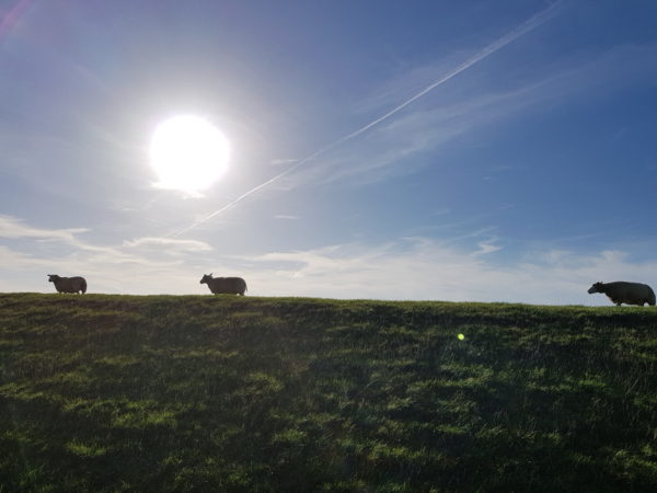 Rechts fonkelt het IJsselmeer tot aan de horizon, links is de Waddenzee. De zon schijnt zonder ophouden, de lucht is een reusachtige koepel boven ons hoofd.